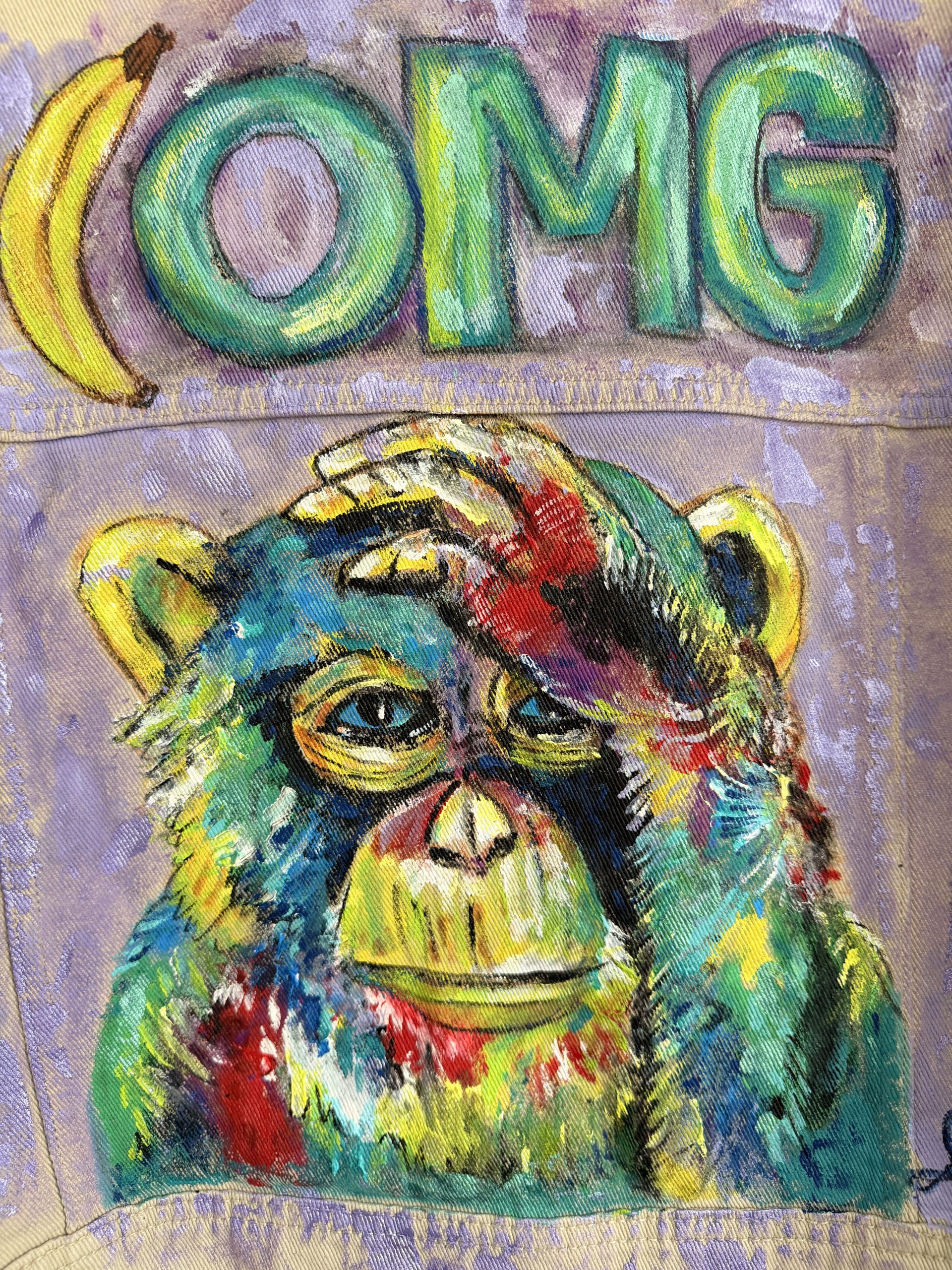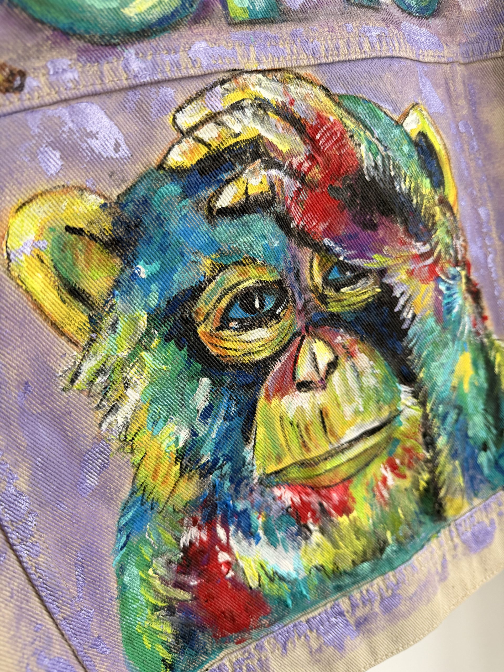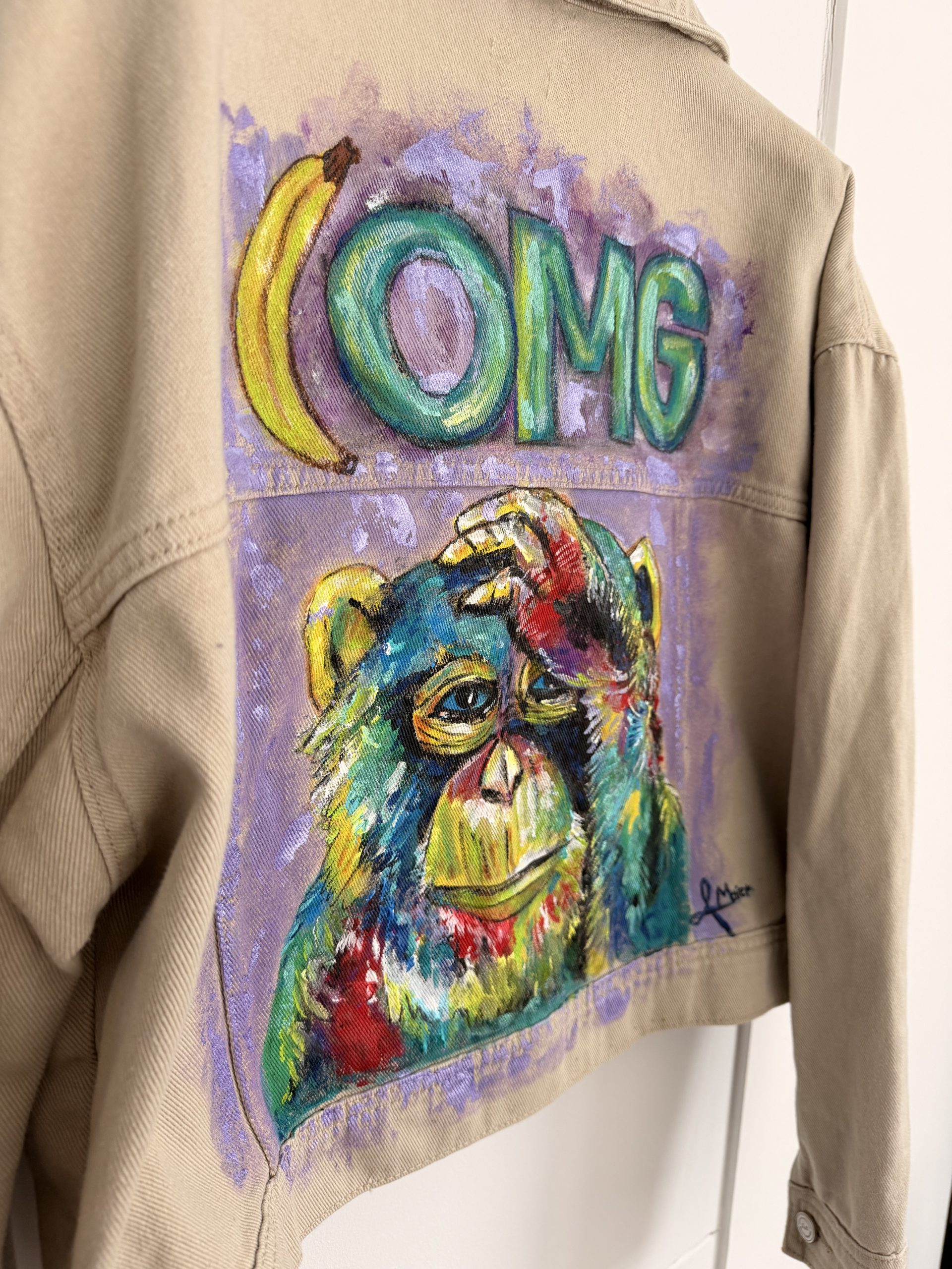 Baige Jeansjacke mit bunten Affen