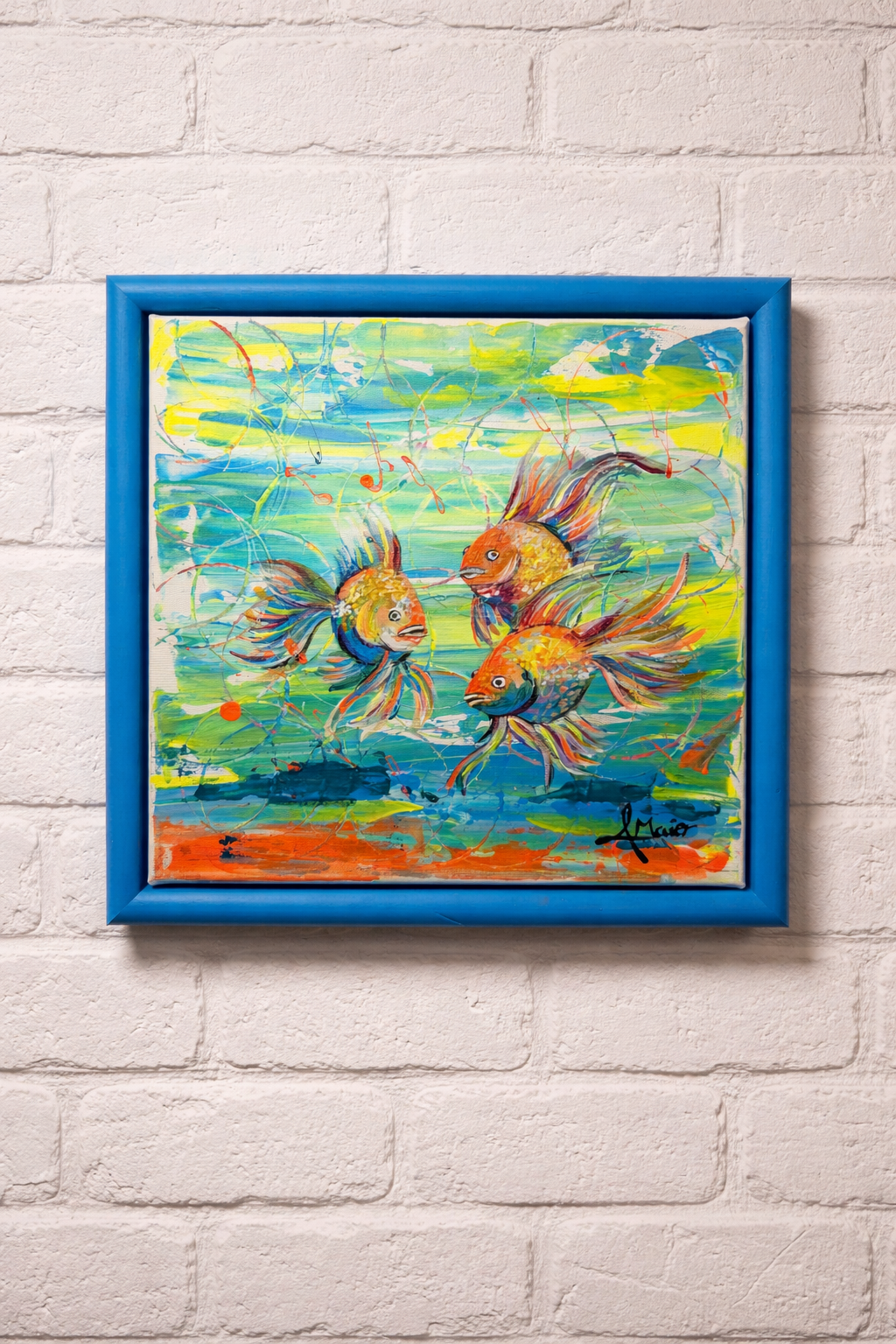 3 Süße Fische treiben sich im Wasser herum. Ein Absoluter Neon-Hingucker mit strahlenden Farben. Es ist eine tolle Geschenkidee. Das farbenfrohes Bild ist auf einer 30x30cm Leinwand entstanden. Auch dieses Bild wurde mit einer Glanzfirnis veredelt und behält für immer seine strahlenden Farben.