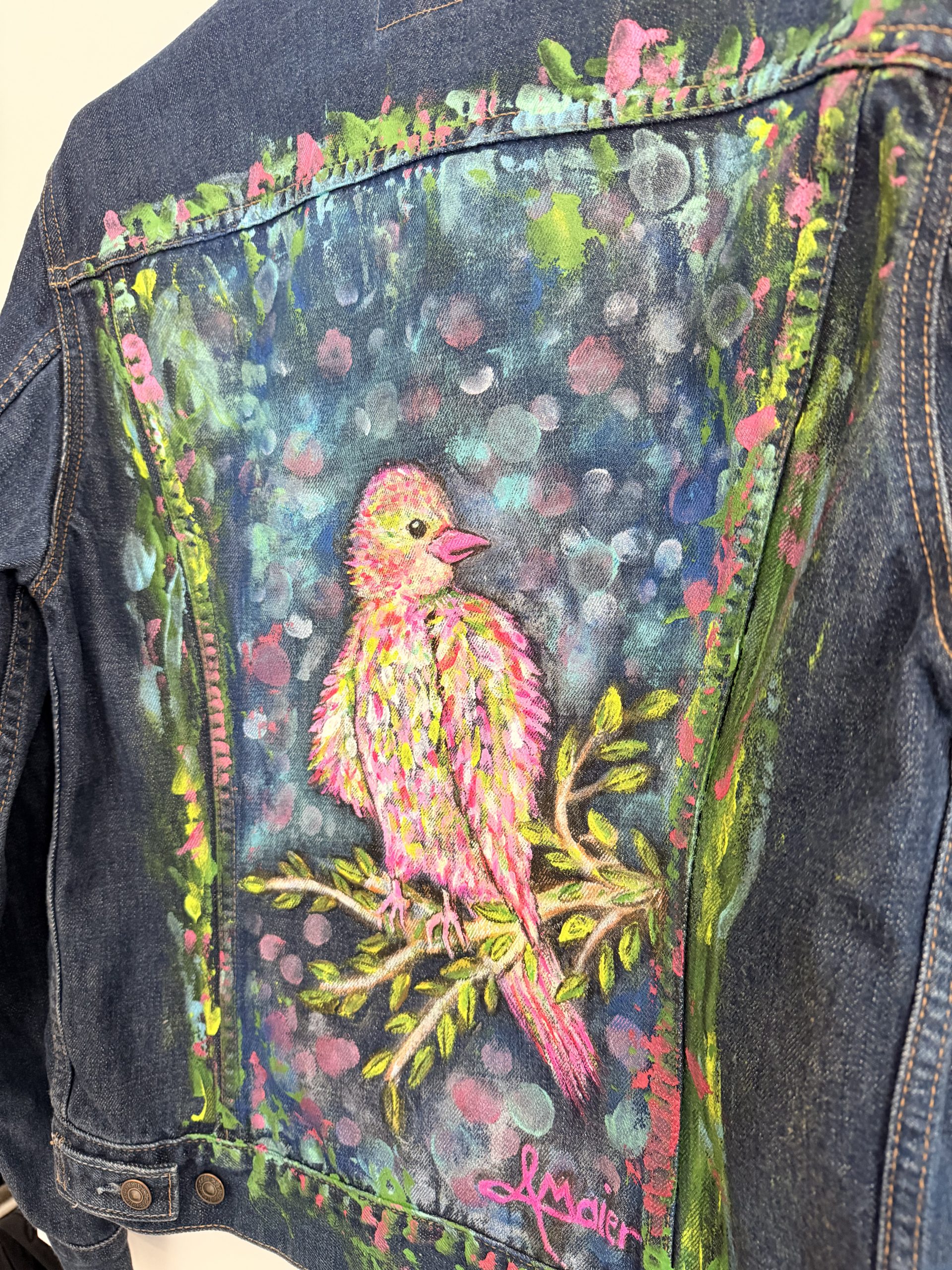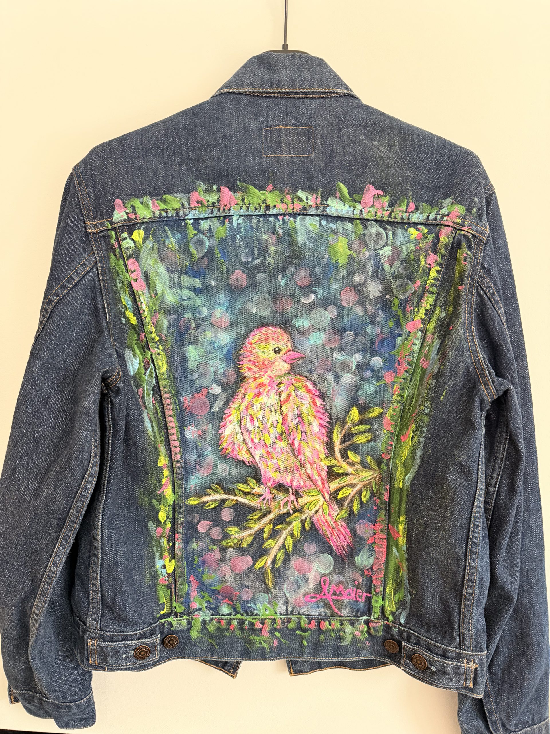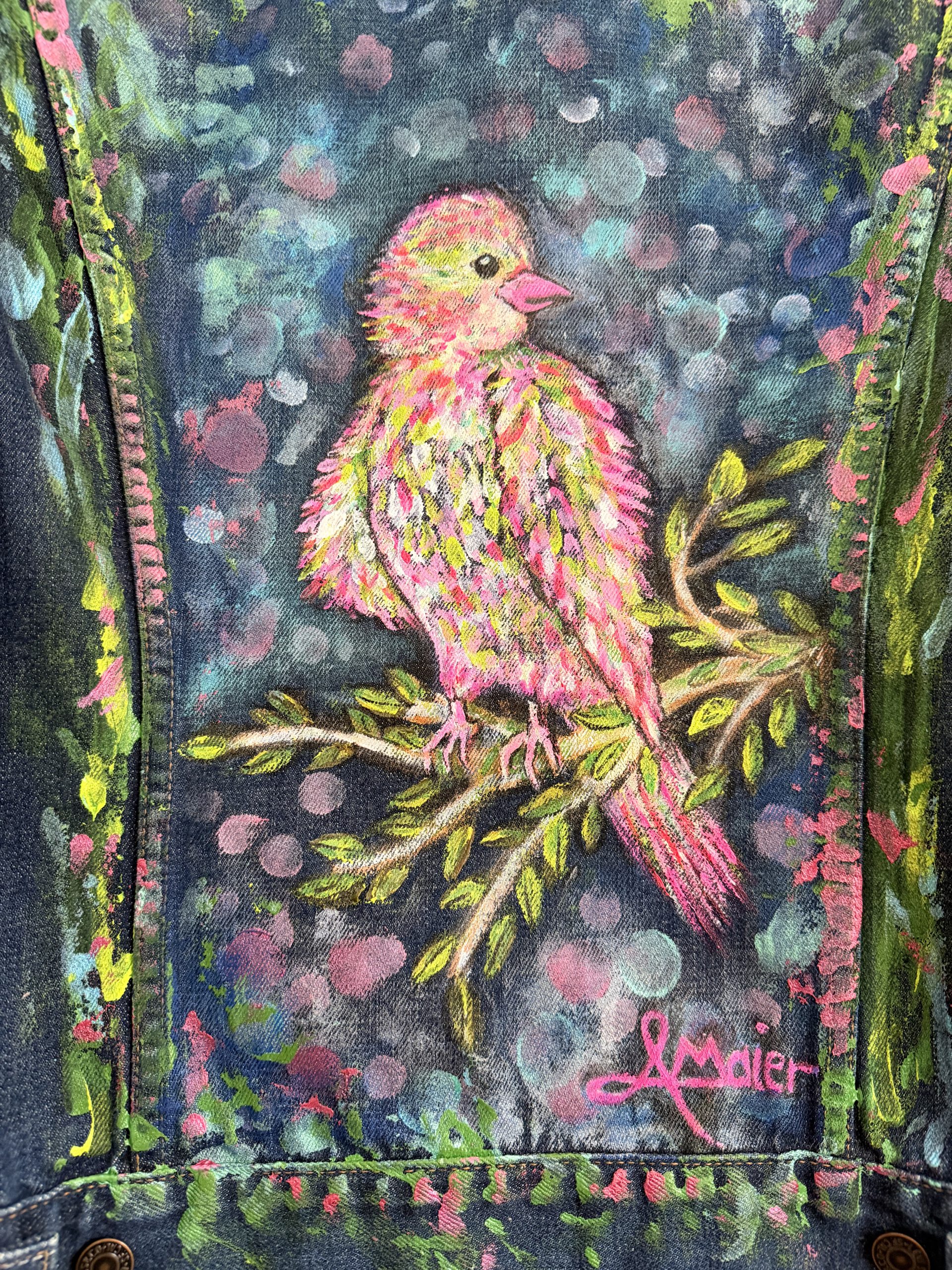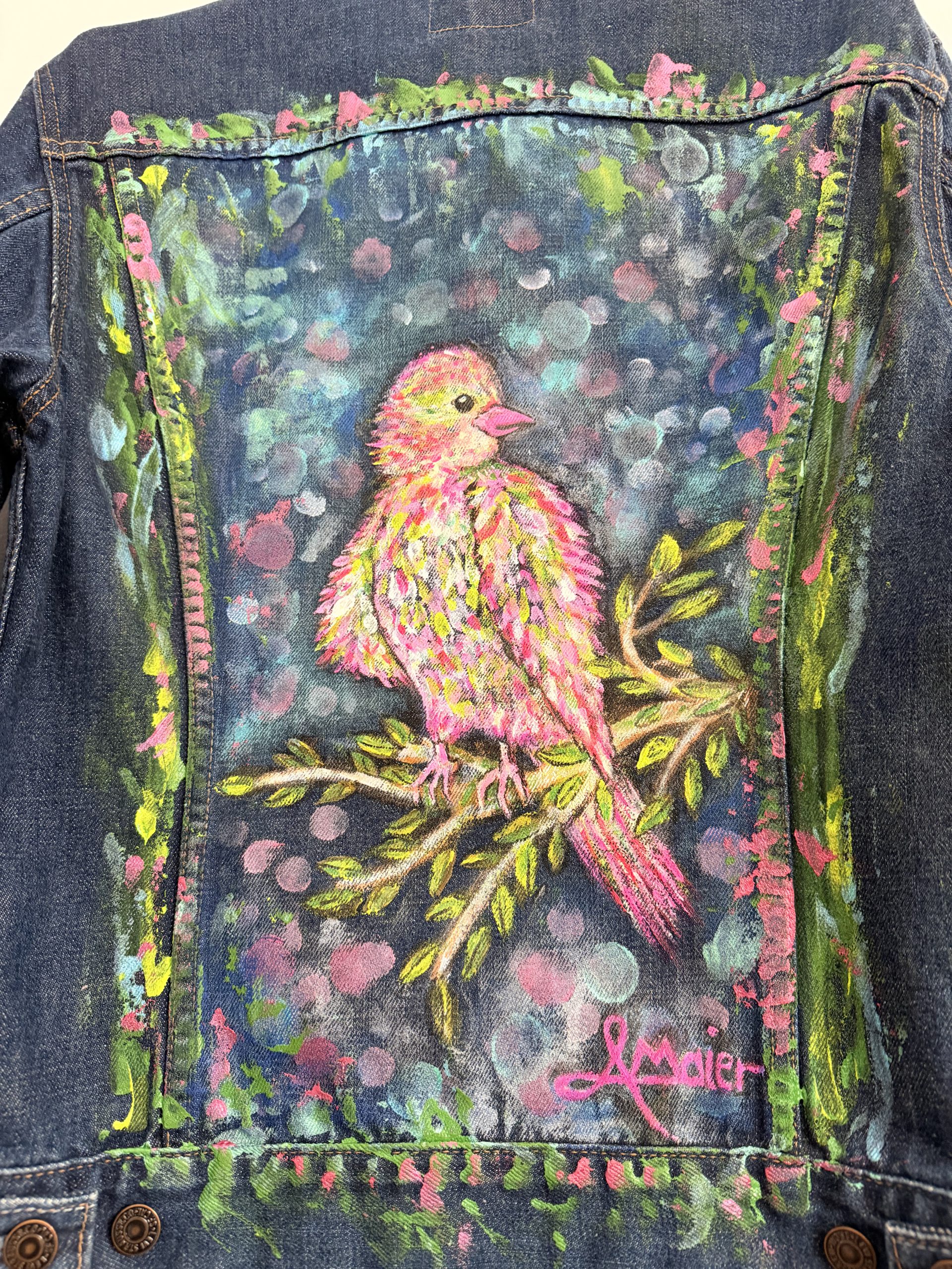 Upcycling meets Art. Eine Sportliche Jeansjacke in Größe L wurde mit farbenfrohen Textilfarben bemalt. Abstrakte verspielte Kunst aus dem Taunus. Ein Hingucker frei nach dem Motto“ Ein schöner Rücken kann auch entzücken“. Sie ist bis 40 Grad waschbar und ideal für kühlere Sommernächte beim Grillen oder auf einem Weinfest.