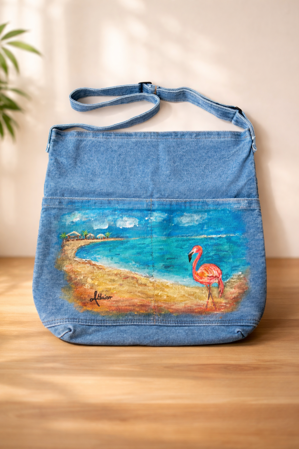Großer Damen Shopper in Denim – Bemalt: Flamingo