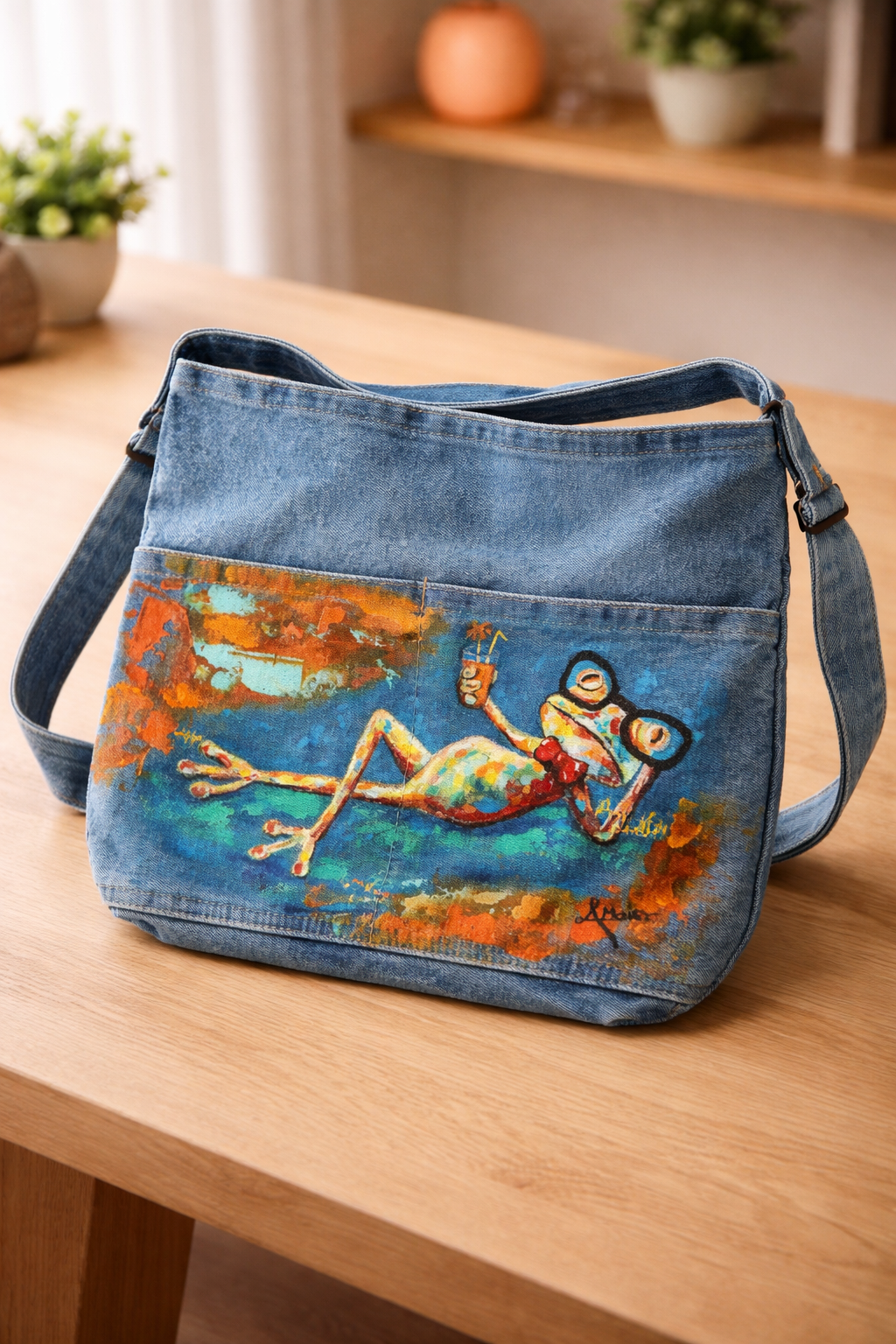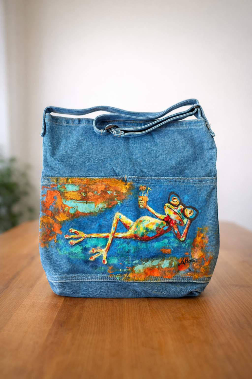 Großer Damen Shopper in Denim – Bemalt: Partyfrosch