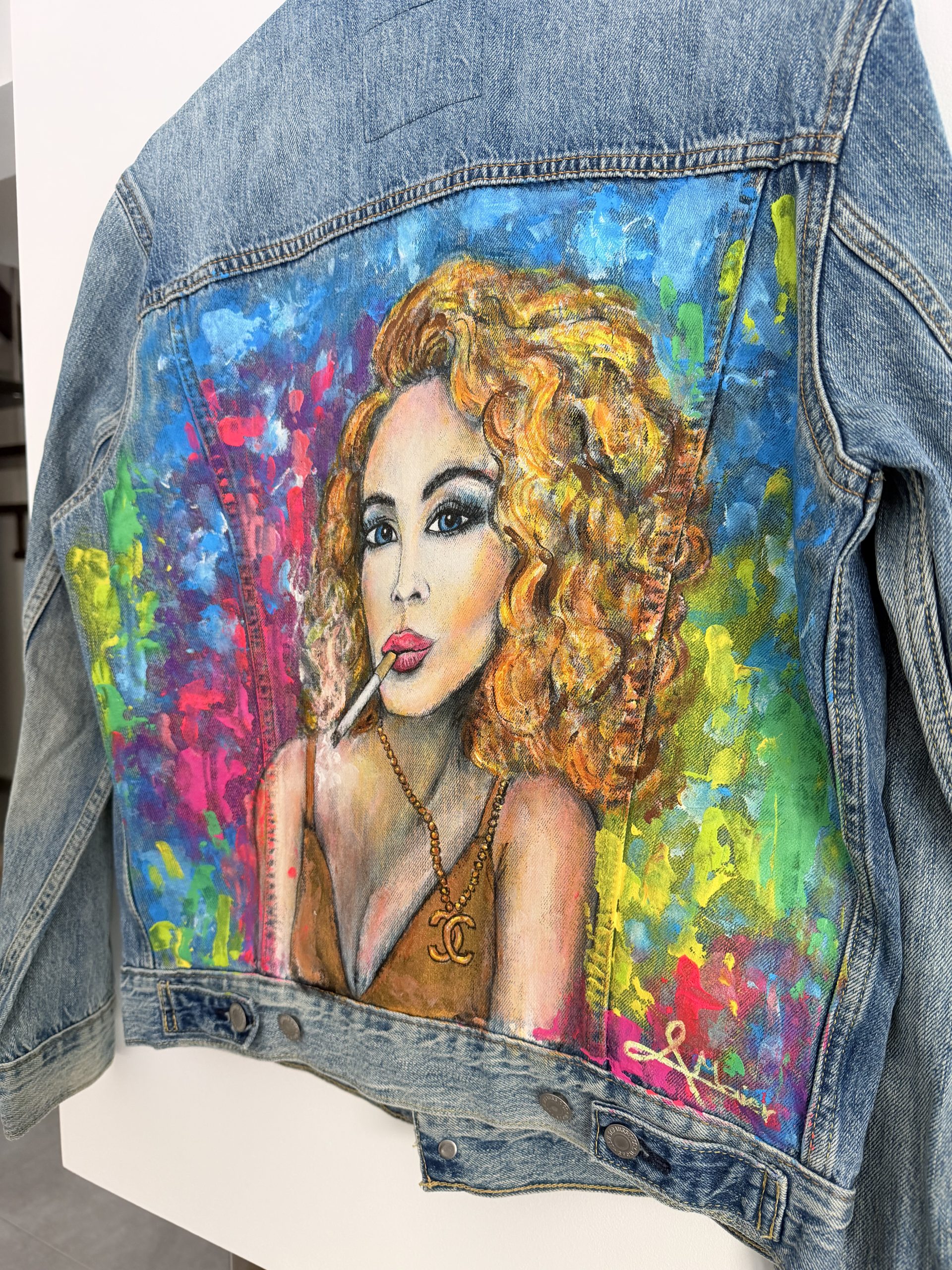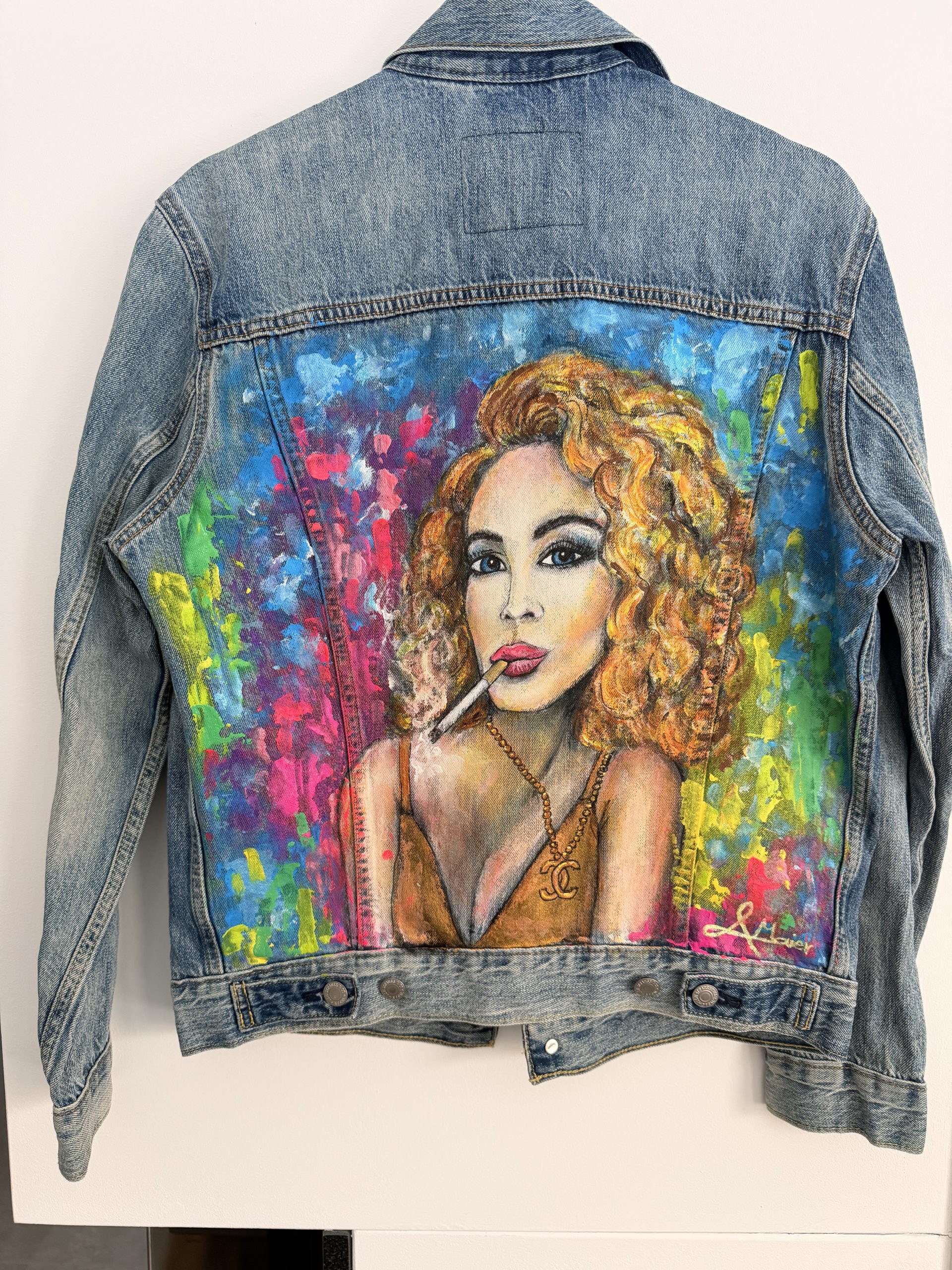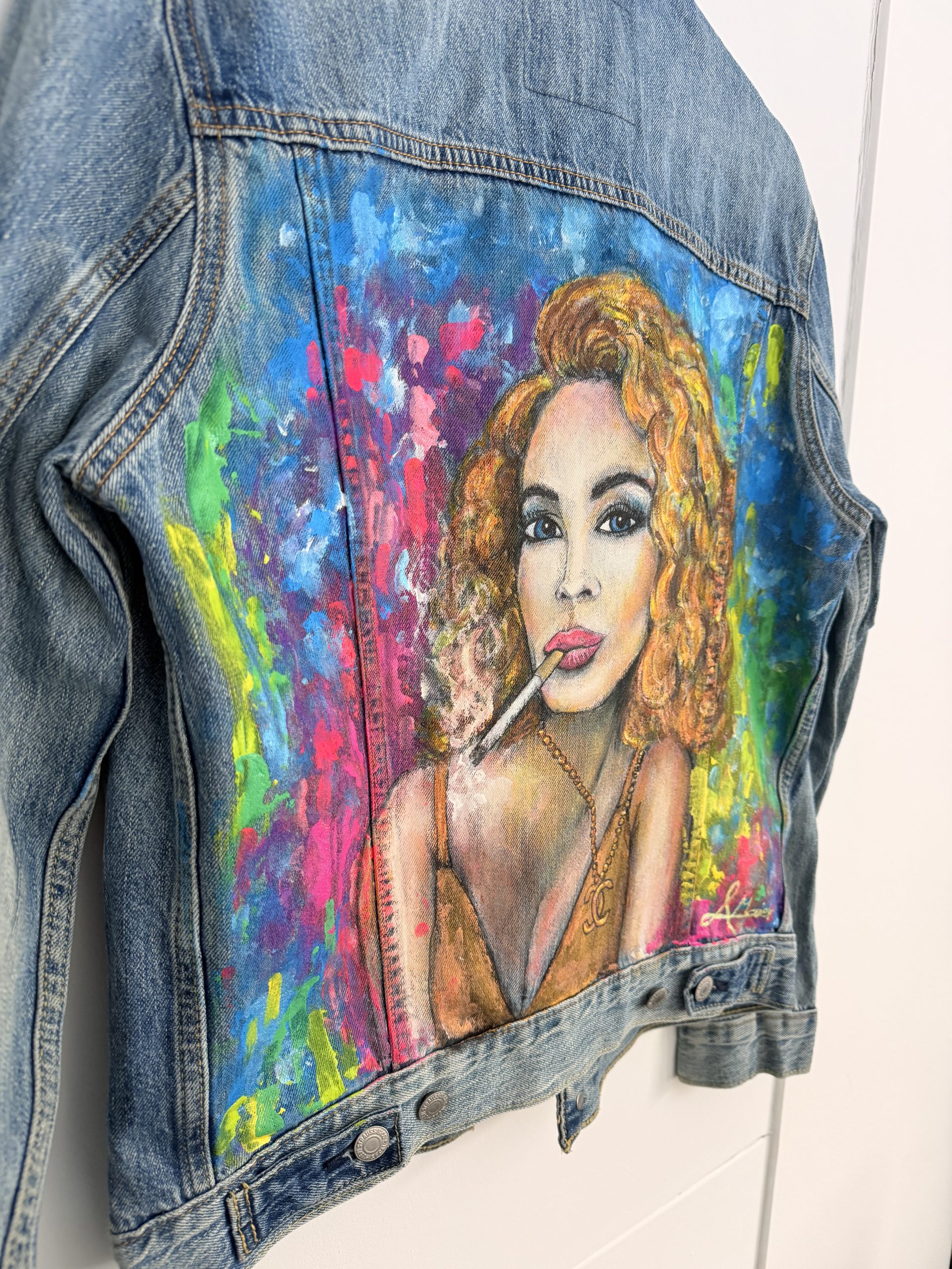 Upcycling meets Art. Eine helle Jeansjacke der Marke LEVI´S in Größe S wurde mit wunderschönen Textilfarben bemalt. Abstrakte verspielte Kunst. Ein Hingucker frei nach dem Motto“ Ein schöner Rücken kann auch entzücken“. Sie ist bis 40 Grad waschbar und ideal für kühlere Sommernächte beim Grillen oder auf einem Weinfest. Für eine wahre Fashionista das ideal Outfit für jede Gelegenheit.