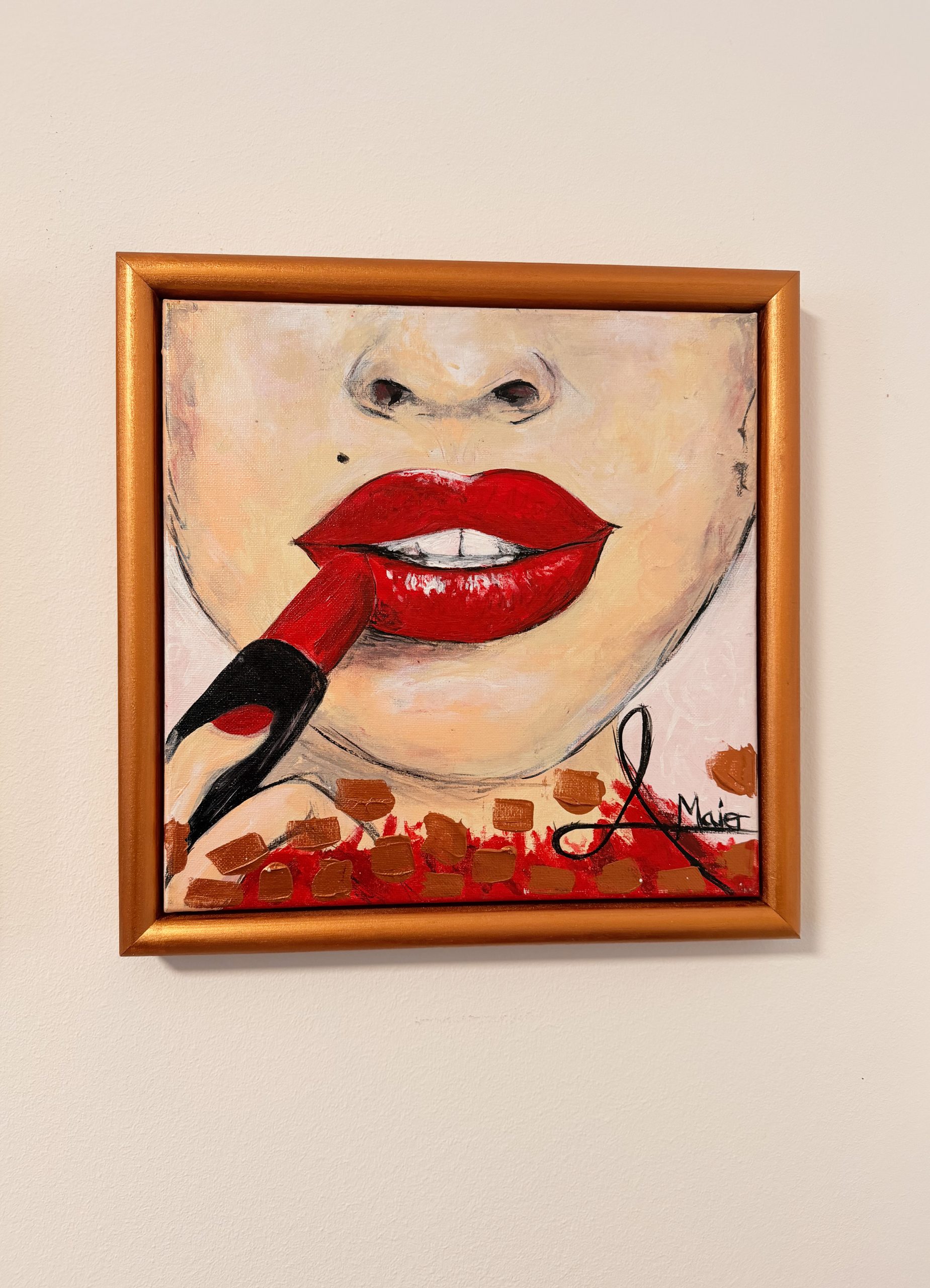 Dieses moderne Bild aus starken Farben veredelt jede Wand. das Gemälde wurde auf einer 30x30cm großen Leinwand mit Acrylfarbe inkl. Metallicspachtelmasse und Glanzfirnis gefertigt. Der rote Lippenstift spricht ebenfalls für puren Luxus und verkörpert Schönheit und Weiblichkeit. Der tolle Schnitt bringt Spannung rein. Auch wunderbar kombinierbar mit den anderen Bildern aus meiner Luxus Serie.